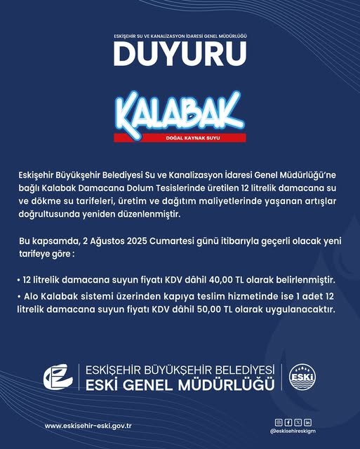 Eskişehir Büyükşehir Belediyesi Su ve Kanalizasyon İdaresi (ESKİ) tarafından işletilen Kalabak Su Damacana Dolum Tesislerinde üretilen damacana sulara zam geldi. ESKİ yetkilileri tarafından yapılan açıklamaya göre, yeni fiyat tarifesi 2 Ağustos 2025 Cumartesi günü itibariyle yürürlüğe girecek.