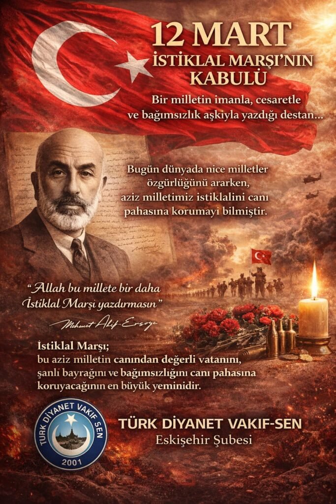 Türk Diyanet Vakıf-Sen Eskişehir Şube Başkanı Hüseyin Poyraz, İstiklal Marşı’nın kabulünün yıl dönümü dolayısıyla yaptığı açıklamada, milli marşın milletin bağımsızlık iradesini ve vatan sevgisini yansıtan en güçlü eserlerden biri olduğunu vurguladı.